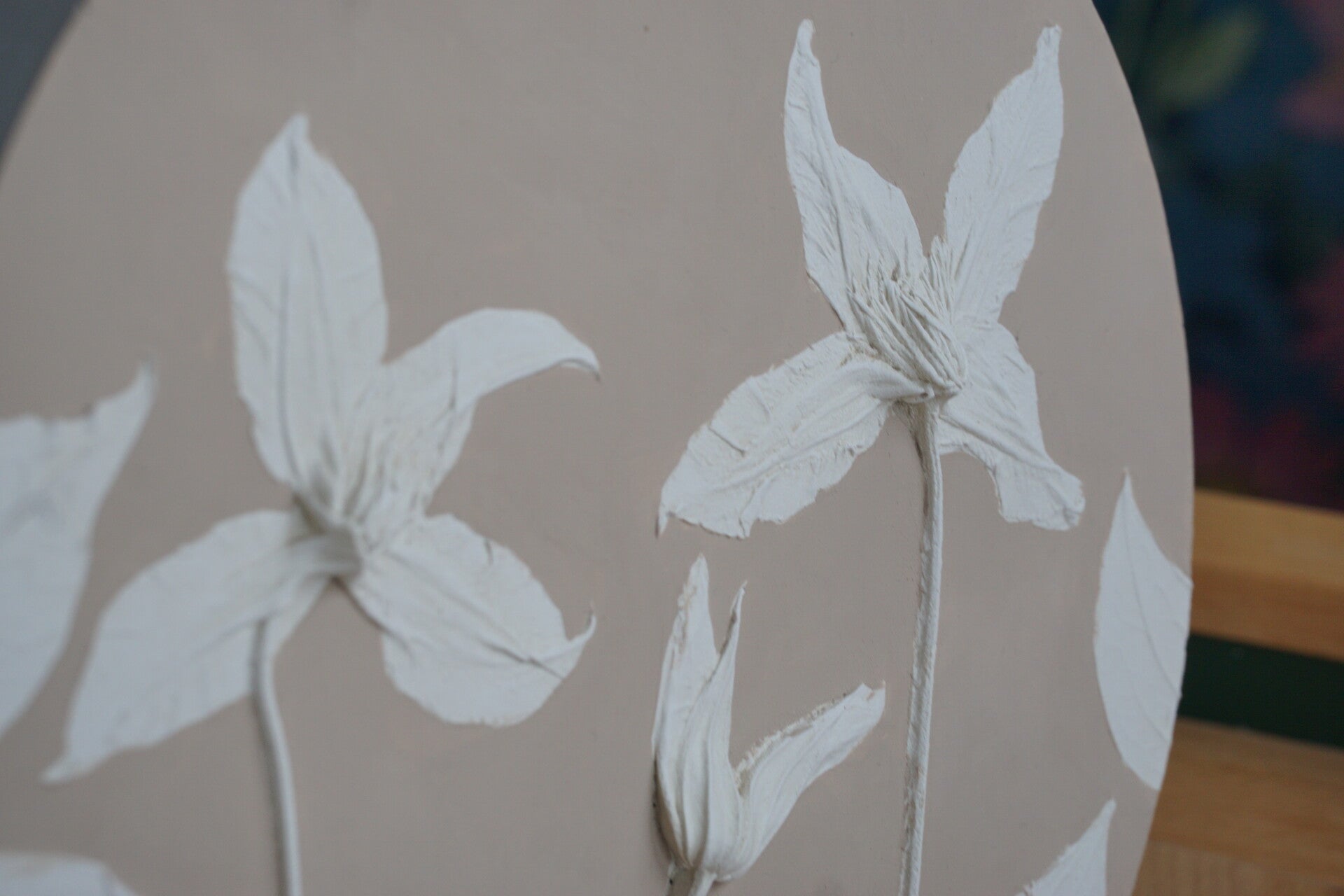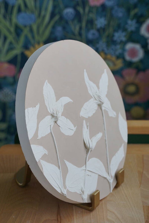 Gipstegel van een clematis, een mooie klimplant met bloemen verkregen bij een bloemist. De achtergrond is met de hand in een mooie beige tint geverfd. Aan de achterkant van de tegel zit een haakje waarmee hij aan de muur gehangen kan worden. De tegel wordt exclusief standaard geleverd.